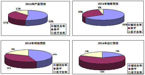 其中,超过半数企业认为2014年的产量、销售都会优于2013年,同时有超过半数企业认为2014年利润、出口会与2013年持平,整体运营趋于稳定。